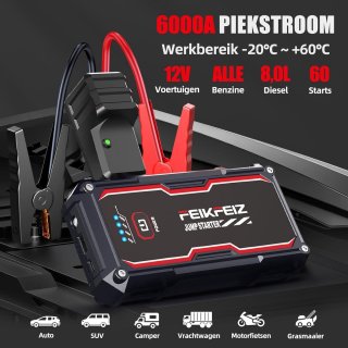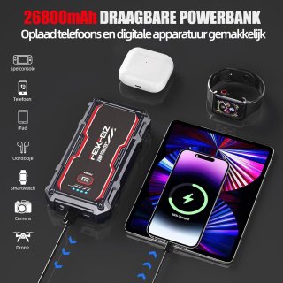 - Krachtig en betrouwbaar — 6000A piekstroom en 26800mAh capaciteit zorgen voor betrouwbare starts van benzine- en zware dieselmotoren.