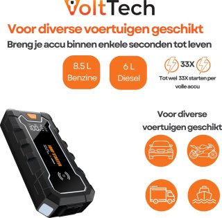 De VoltTech Jumpstarter is eenvoudig in gebruik: sluit de slimme startkabels aan, volg de aanwijzingen en binnen enkele seconden draait de motor weer. Dankzij de grote accucapaciteit kun je tientallen keren starten zonder tussentijds opladen — ideaal voor auto’s, scooters, motoren, boten en zelfs vrachtwagens. Het compacte formaat maakt de starter gemakkelijk op te bergen in de kofferbak of bergruimte.