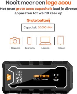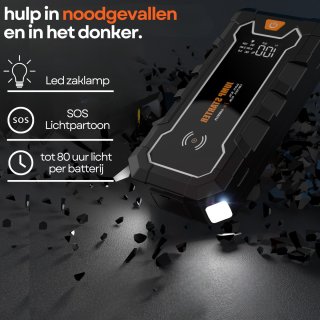 - Multifunctioneel: jumpstarter, powerbank en zaklamp (incl. SOS-modus) in één compact apparaat.